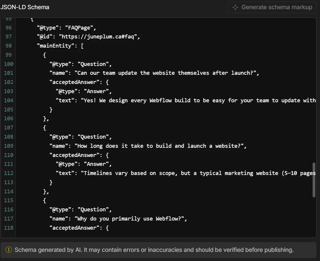 ✅ Webflow AI schema generator: Webflow has made the process easy to create an update schema in their page settings with AI generated schema.